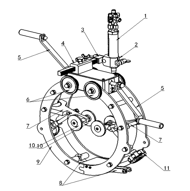 6.驅(qū)動(dòng)輪 7.夾緊裝置 8.鎖緊裝置 9.圓形導(dǎo)軌 10.夾緊輪