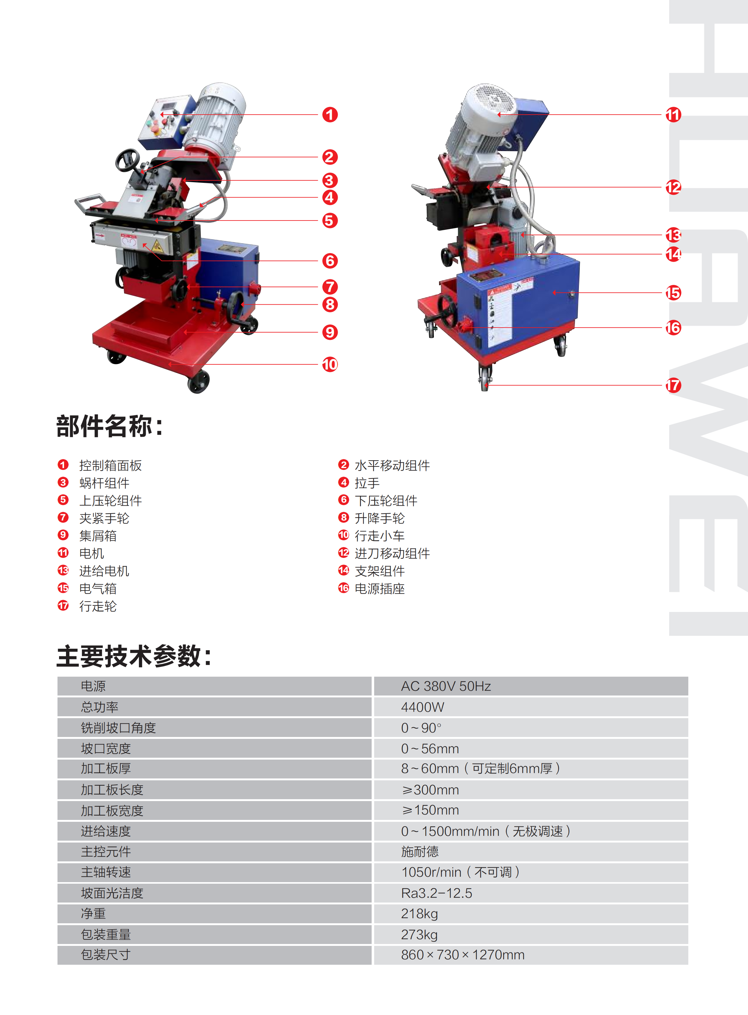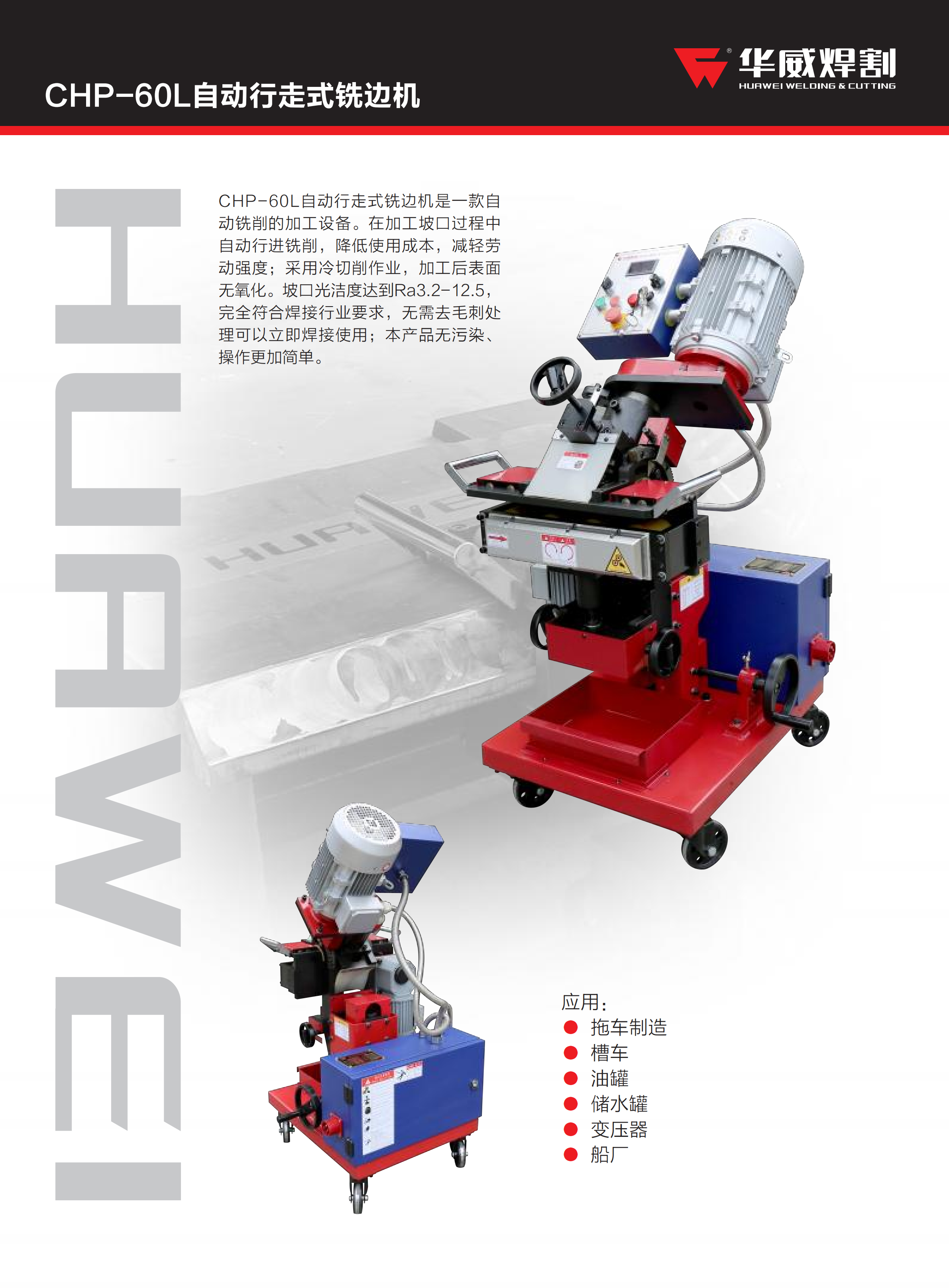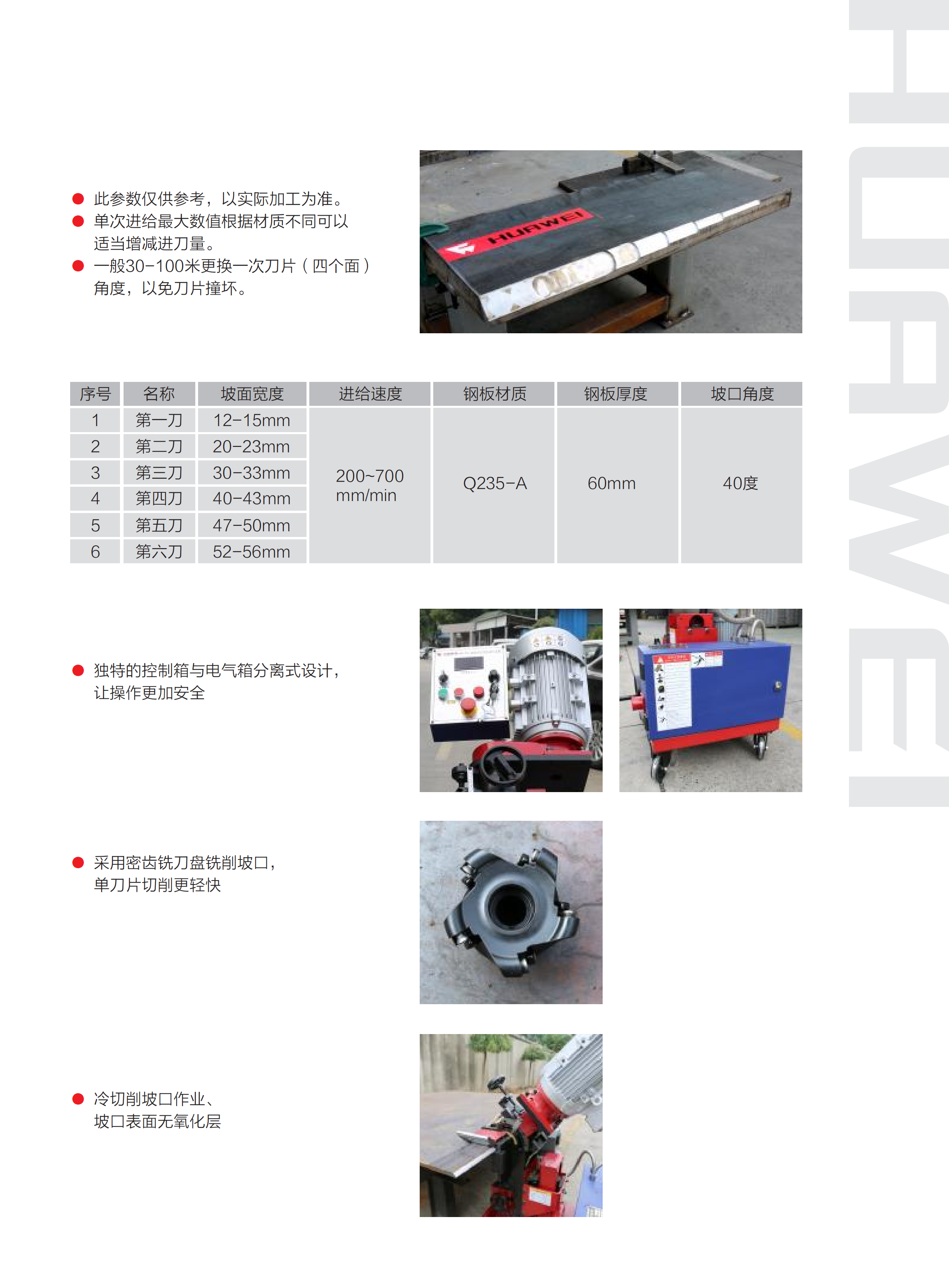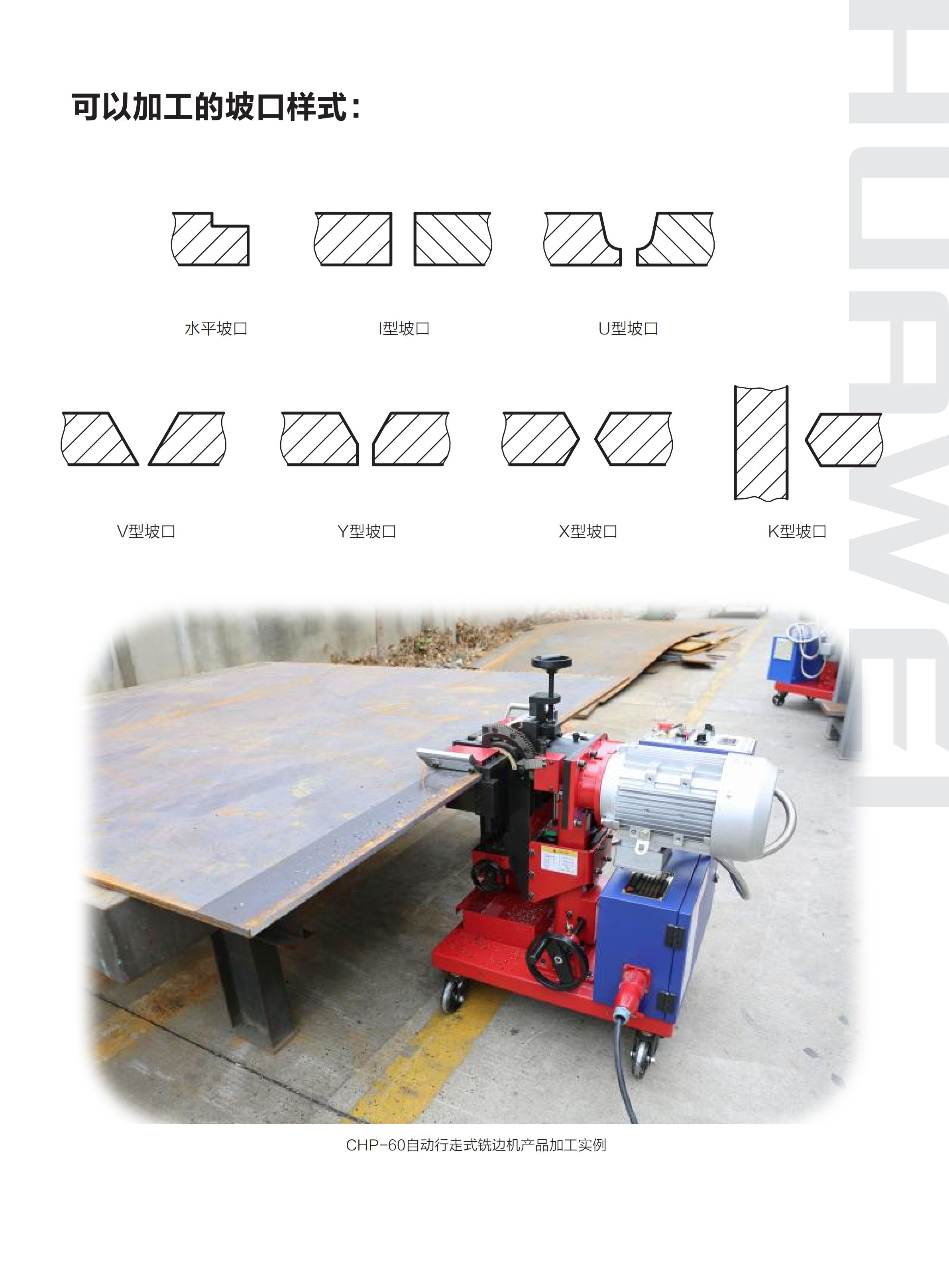 本產(chǎn)品是一款自動(dòng)行進(jìn)式銑邊設(shè)備,加工坡口過程中自動(dòng)行進(jìn)銑削,降低使用成本,減輕勞動(dòng)強(qiáng)度,采用冷切削作業(yè),加工后的坡口表面無氧化。坡口表面光潔度Ra3.2~6.3.完全符合焊接行業(yè)要求,無需去毛刺處理可以立即焊接使用,本品無污染,操作更加簡(jiǎn)單。