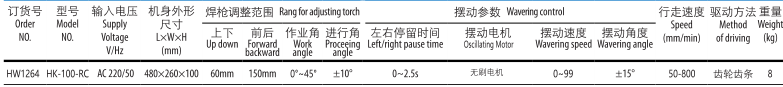 HK-100-RC 擺動式自動焊接小車,對接垂直水平等多用途自動焊接小車,焊槍具有擺動功能,通過設(shè)置擺動速度,角度,中心偏移位置哦左右停留時(shí)間來獲得最佳焊接效果。通過數(shù)顯可準(zhǔn)確設(shè)置速度以及擺頭的參數(shù)。驅(qū)動部位安裝了手動離合器,方便了機(jī)器在軌道上定 位及返回焊接起點(diǎn),小型軌道移動方便,安裝有離合球磁螭使用方便。廣泛應(yīng)用于船舶、橋梁、機(jī)車、石油化工,鋼結(jié)構(gòu)工程等。 注:標(biāo)配一根長度為1.8米的導(dǎo)軌。