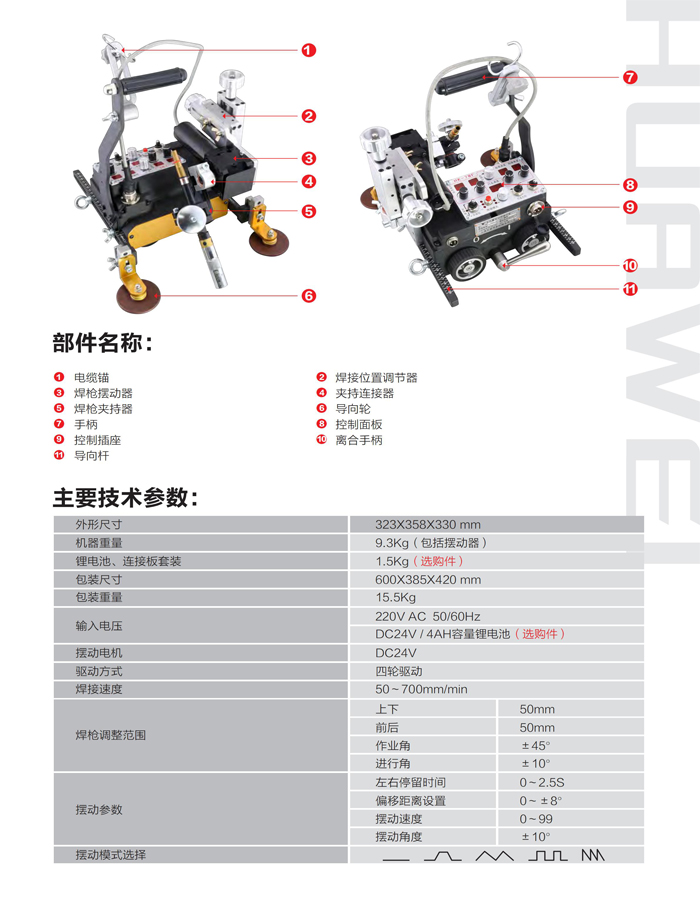 減少勞動強度,改善作業環境。提高工作效率,是手工焊的1.5倍。避免人為因素所造成的焊縫質量不良,一般的手工操作的不良率在20%左右,而采用自動焊接小車沒有產生焊接不良率, 因此其綜合效益,比手工焊提高近200%。自動化程度高,確保焊接質量的穩定性。非熟練的技術工人也能快速掌握:HK-7W-F全位置擺動式自動焊接小車是在標準角焊機的基礎上,為獲得較大的焊縫尺寸并且一次成型而開發出來的帶擺動器的焊接小車。它兼有標準角焊機簡單輕便的特點,又能進一步提高焊接效率。