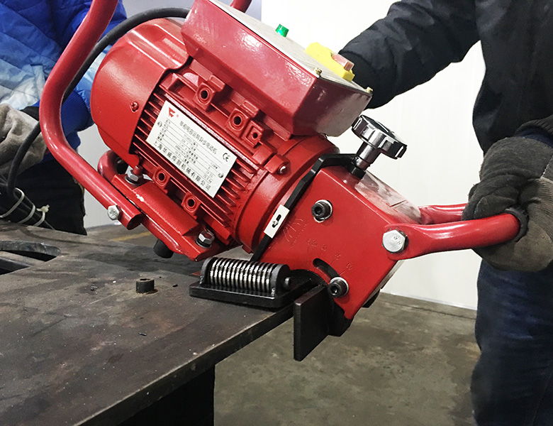 在啟動之前,請注意坡口機(jī)的放置位置,不同的位置采用不同的操作方式。如果你需要把它放于工件的邊緣,則以平行方式固定設(shè)備,使刀盤不碰觸工件(工作臺長度的2/3)。然后啟動,不斷地慢慢地引導(dǎo)銑刀沿箭頭指示的方向工作。