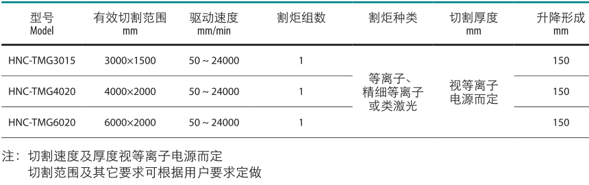 TMG系列是一種高速,精密的等離子或類激光數(shù)控切割機(jī)。使用一體式模塊化結(jié)構(gòu),使安裝迅速,方便。可以加配抽煙工作臺(tái),以達(dá)到環(huán)保要求。本機(jī)特別適用于中厚,薄有色金屬板材,不銹鋼,鋁,碳鋼板材的高速切割。