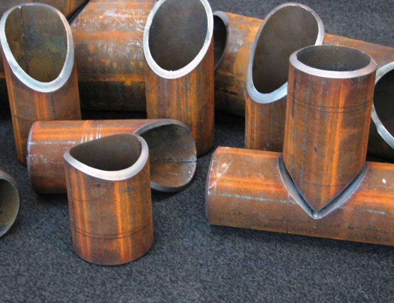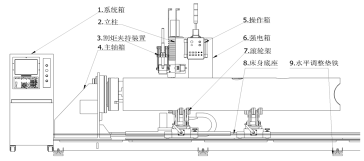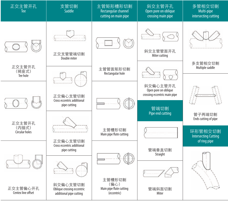本機(jī)是一種對鋼管端部結(jié)合處作自動計算和切斷的設(shè)備。該機(jī)器能廣泛應(yīng)用于建筑、化工、機(jī)械、冶金等行業(yè)的管道結(jié)構(gòu)件的切割加工。這些行業(yè)中有大量的管道結(jié)和相貫線孔、相貫線端頭,還有俗稱“蝦米節(jié)”的彎頭,此類加工大多采用制作樣板、劃線、人工放樣、手工切割、人工打磨等落后又繁復(fù)的方法來進(jìn)行。而本機(jī)能十分方便的切割此類工件,并且操作人員不需計算與手工編程、只需輸入相互配合的管子的半徑、相交角度等參數(shù),機(jī)器就能自動切割出管子的相貫線、相貫孔、以及焊接坡口。